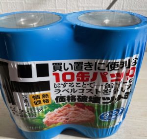 ドン・キホーテのツナ缶は、10缶入って598円(698円)という嬉しい価格でした。
